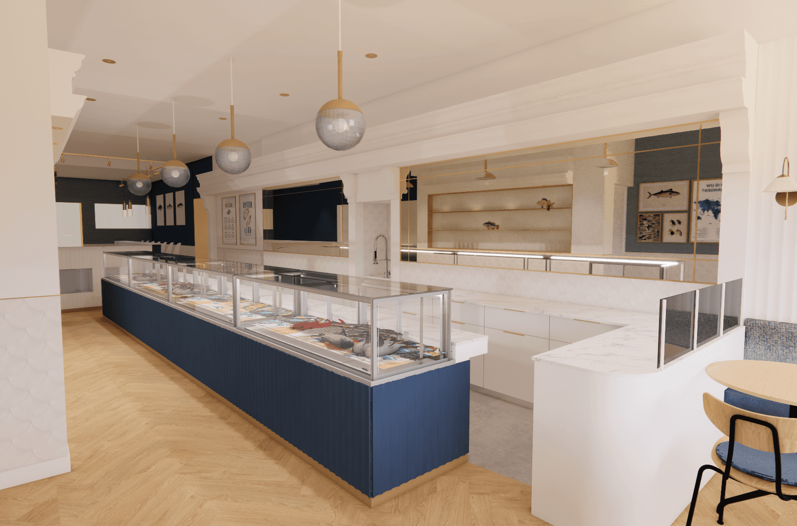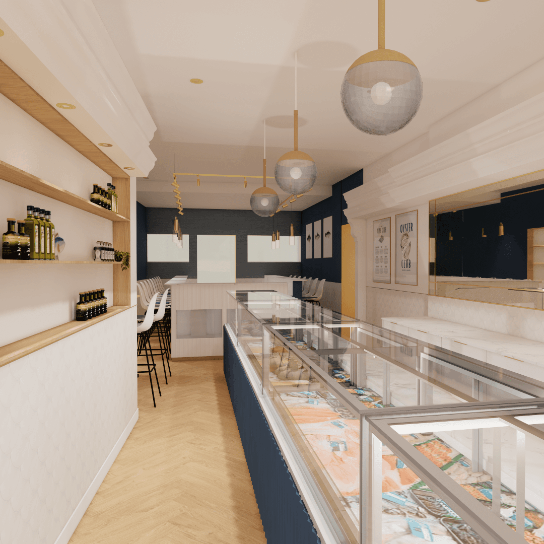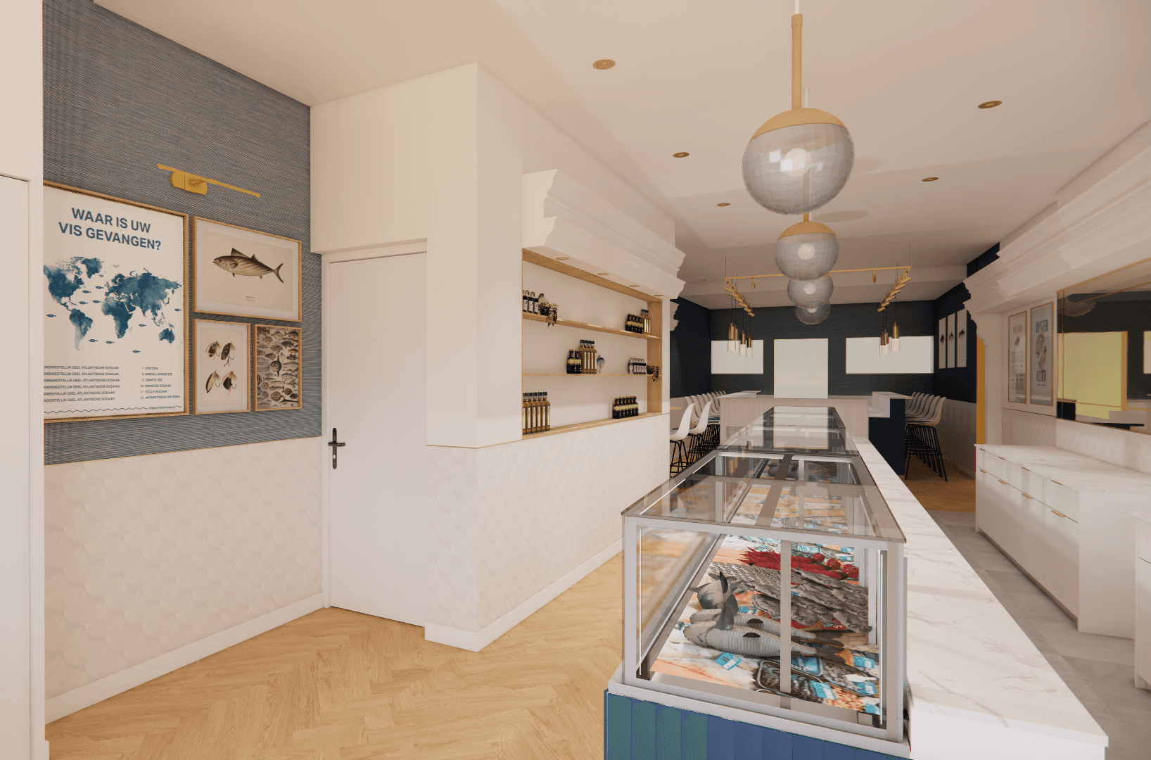 Op basis van dit onderzoek maakte Stan een moodboard. “Ik heb veel inspiratie opgedaan op o.a. Pinterest. Omdat het een smal pand is in het centrum van Den Bosch, wilde ik graag organische vormen gebruiken. Dit straalt rust uit. Daarnaast vond ik de kleur blauw goed passen bij een viswinkel.”