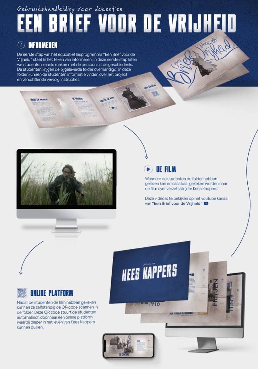 The gap between the events of World War II and the younger generations is widening. They no longer link it to modern times and their daily lives. More than half of high school students do believe they can learn from it. They just need more tangible teaching materials that make it easier to personally connect with history. The curriculum lets students make personal links between past, present and future in a special way. By following 5 simple steps, pupils are taken back in time. They are introduced to someone who contributed to their freedom during World War II. In this way, the teaching programme creates in a modern and unique way the opportunity to offer tangible lessons to the new generation of young people. In this way, it teaches them that the freedom they experience today cannot be taken for granted.