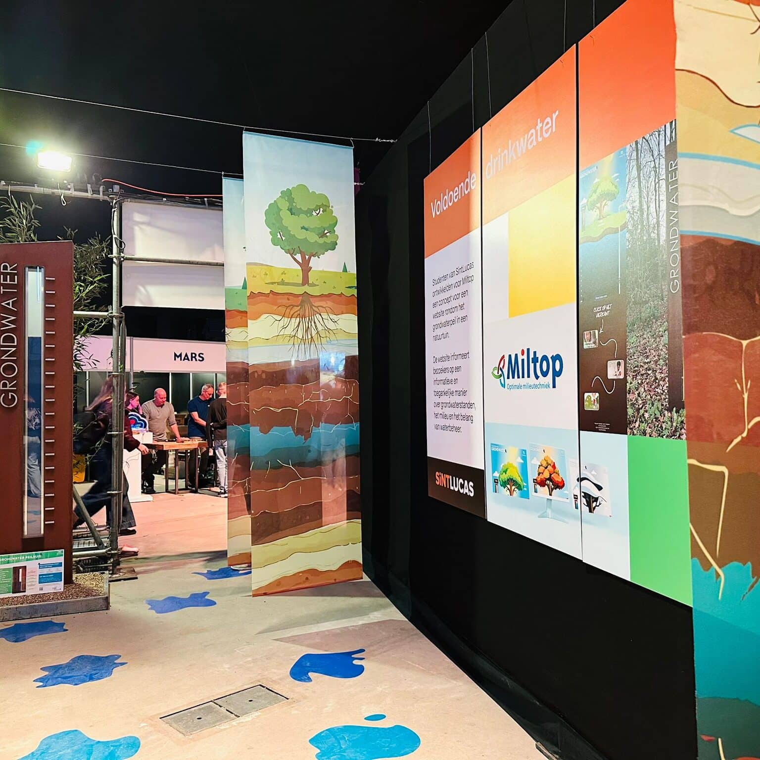 Voordat water bij ons terechtkomt, legt het een lange reis af door de waterkringloop. Miltop is specialist in bodem en grondwater en staat voor duurzame oplossingen op het gebied van waterbeheer en bodemgezondheid. Studenten van SintLucas hebben dit proces tot leven gebracht in visueel aantrekkelijke, begrijpelijke uitingen. In de stand loop je als bezoeker als het ware door deze waterkringloop.